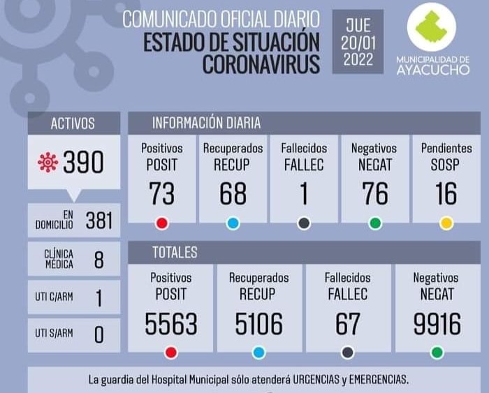 Un leve repunte en los casos activos de Covid se produjo en las últimas 24 horas tras varias jornadas donde se estaban dando descensos. En esta ocasión, fueron 73 positivos en tanto que hubo 68 recuperados por lo que los activos quedaron en 390, de los cuales 9 se encuentran internados en el Hospital Municipal (8 en Clínica Médica y 1 en Unidad de Cuidados Intensivos con asistencia respiratoria).