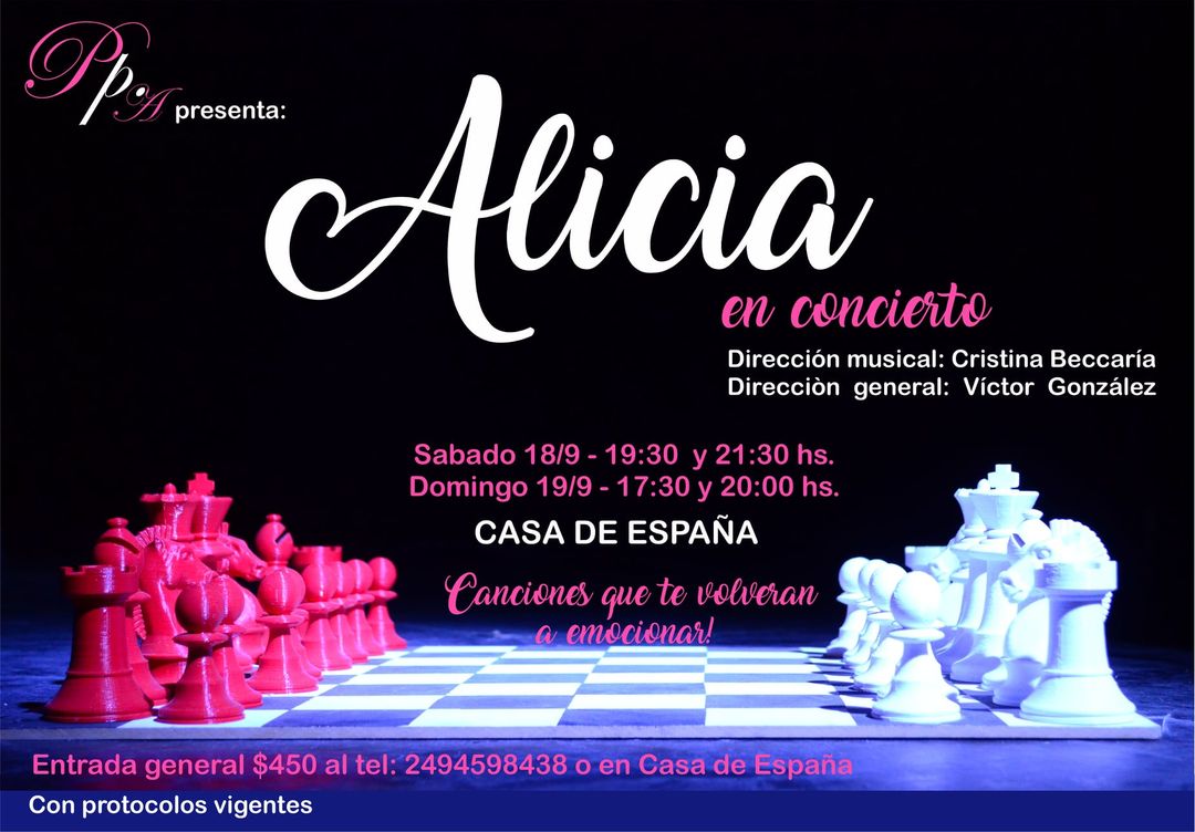 “Alicia en Concierto” es un espectáculo con cantantes y actores de Ayacucho bajo la dirección musical de Cristina Beccaría y con Víctor González como Director General. Las entradas tendrán un costo de $450 pudiéndose comprar en Casa de España o encargarse al celular 2494598438.