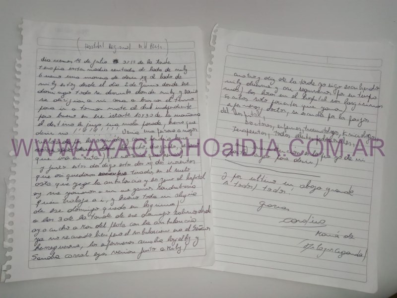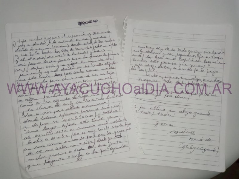 El diario digital www.ayacuchoaldia.com.ar accedió a una serie de notas escritas por la mamá de Mili Ciganda, que ella misma nos dio para que podamos publicar, y así compartir sus momentos de angustia y sus sentimientos por la situación que les toca vivir desde el pasado dos de junio, cuando se registró el accidente.