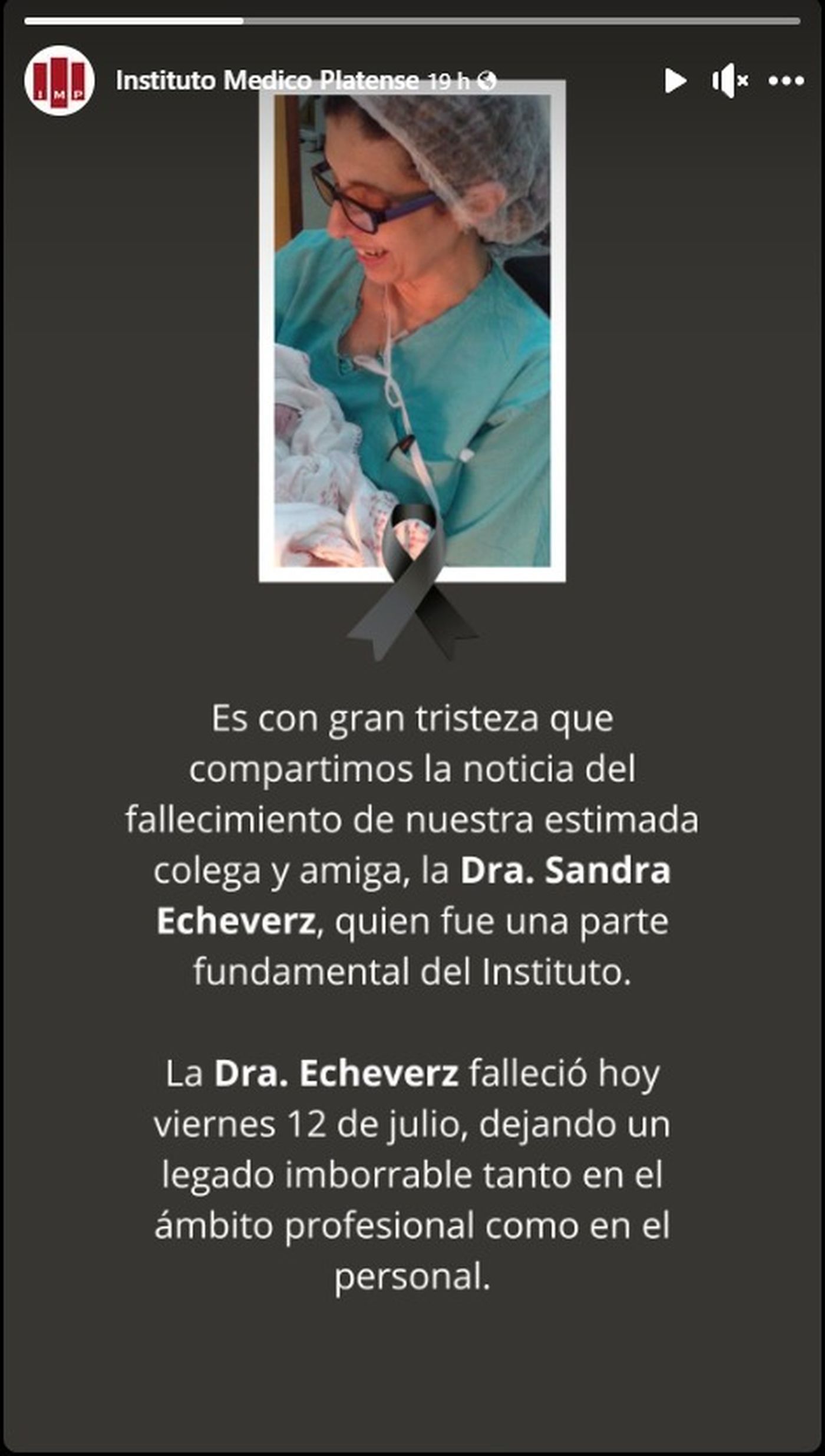 Entre los recuerdos que circularon en las redes sociales está el del Instituto Médico Platense, que compartió una historia en Facebook, atribuyéndole a la profesional un «Legado imborrable, tanto en lo profesional como en lo personal».