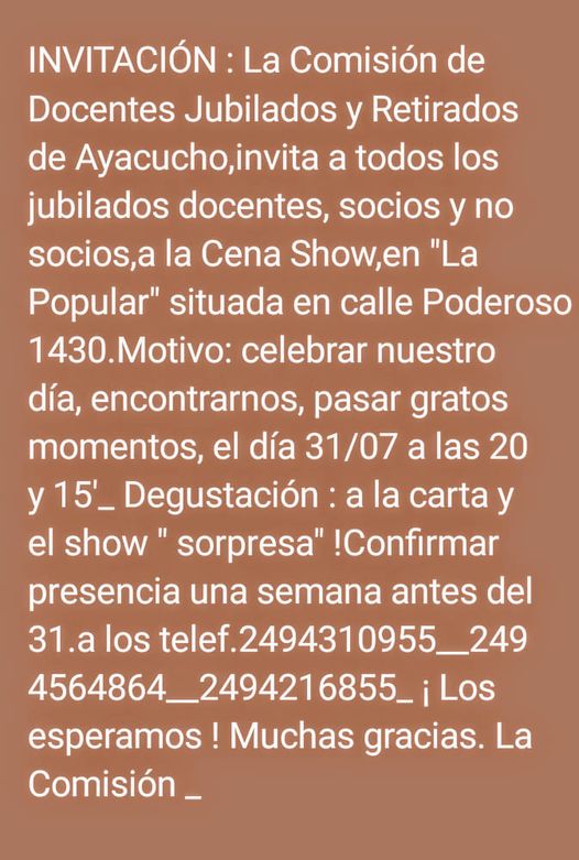 Los Docentes Jubilados invitan a una Cena Show para el miércoles 31 de Julio de 2024 10 julio, 2024 Pablo Tusq destacados, Locales, locales DIA 0 X