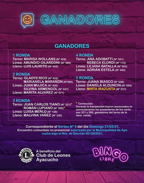 Este domingo 21 se concretó una nueva edición del Bingo Libre que fue a beneficio del Club de Leones, con $52.600 pesos en premios, y para el cual se habían vendido todos los cartones. El premio mayor con 26.300 pesos fue para Mirta Irazusta.
