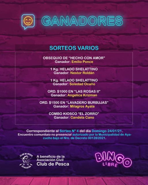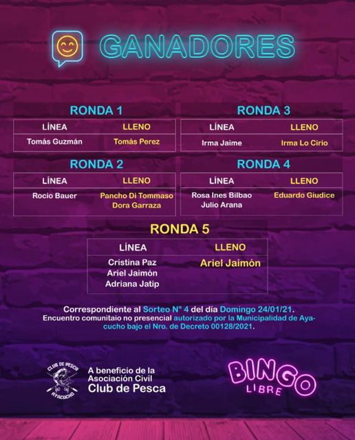 Este domingo se concretó una nueva edición del Bingo Libre que en esta oportunidad fue a beneficio del Club de Pesca, en lo que resultó un éxito rotundo ya de antemano dado que se lograron vender todos los cartones que se ofrecieron. El ganador de la ronda final fue Ariel Jaimón.