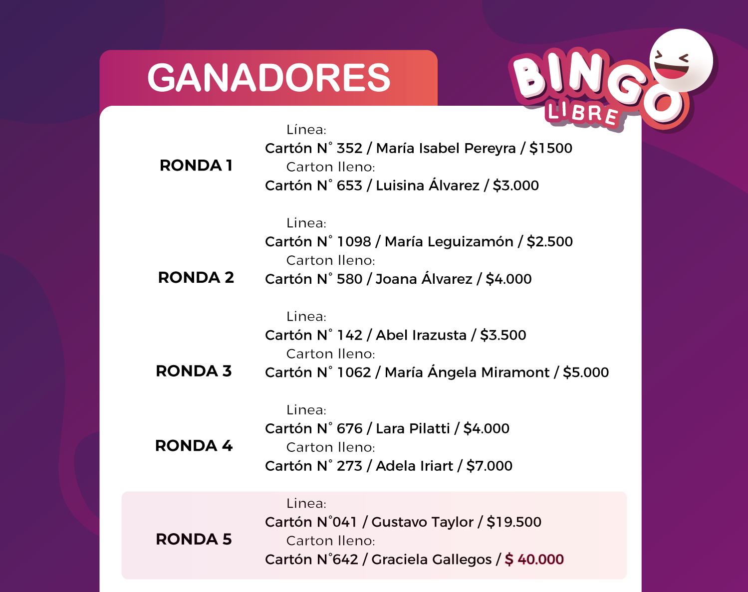 Este domingo y nuevamente con notable éxito, se concretó la edición del Bingo Libre a beneficio del Colegio Nuestra Señora del Buen Consejo. El cartón lleno de la 5ª ronda fue la Graciela Gallegos (NdR: Secretaria de la entidad) quien se alzó con $40.000. La línea de la ronda final había sido para Gustavo Taylor, quien ganó $19,500.
