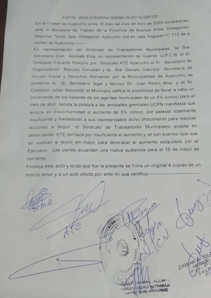 A su vez, agregaron que “ATE Ayacucho rechazó de plano por insuficiente este incremento que otorgarán para Abril porque sabemos que los municipales están cada vez más complicados en lo económico, absolutamente por debajo de la línea de la pobreza, esa a la que el gobierno de Javier Milei nos está llevando apoyado por ideales y acciones como las que toma el Ejecutivo en Ayacucho. Son cada vez más parecidos”.