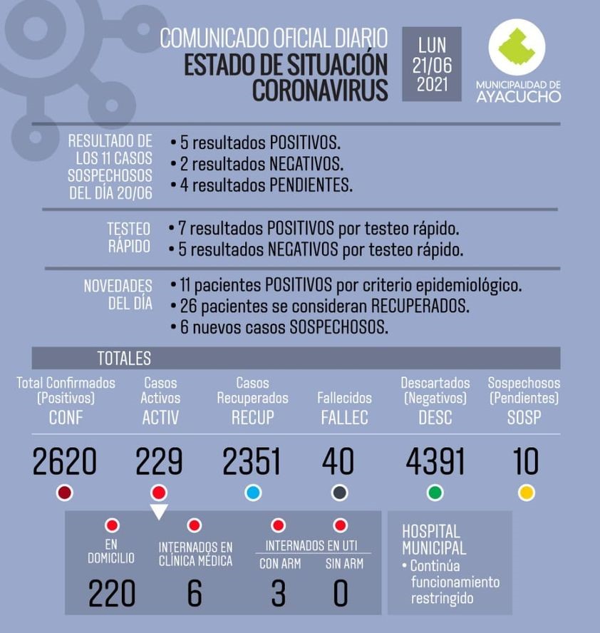 Con respecto a la situación hospitalaria, de ese total de activos, 9 se encuentran internados en el Hospital local: 3 en UTI con asistencia respiratoria y 6 en Clínica Médica.