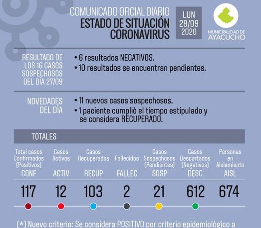 Un lunes 28 de Septiembre sin casos positivos confirmados. De los 16 casos que habían quedado pendientes por resolver, se informó este lunes que 6 de ellos fueron negativos de Covid mientras que el resto permanece aún pendiente.