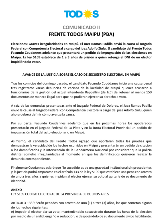 A lo conocido sobre la denuncia que realizó el Frente de Todos en Maipú sobre el Intendente de Juntos por el Cambio, Matias Rappalini, quien está acusado de haber impedido votar a no menos de 150 personas, reteniéndoles el DNI, y que le permitió renovar la Intendencia por apenas 63 votos, en un comunicado enviado a nuestro portal señalan que pedirán la impugnación de los comicios.