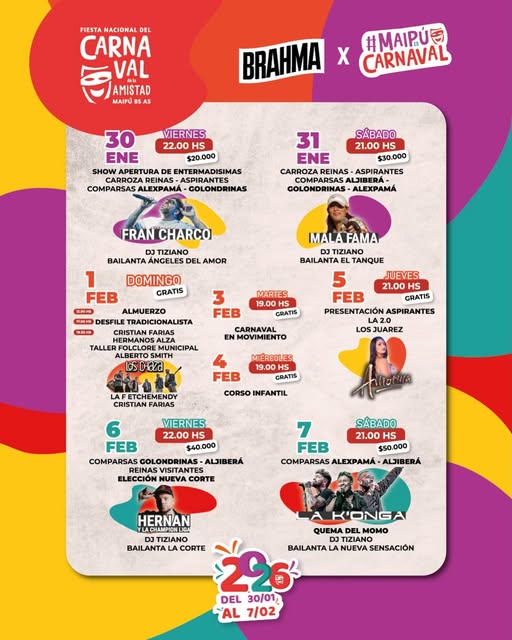 Arancelada. Domingo a las 11:00, almuerzo; 17:00, desfile tradicionalista y a las 19:00, espectáculos musicales con Los Chaza. Gratis. Martes 3, carnaval en movimiento a las 19:00; miércoles 4, carnaval infantil a las 19:00, y jueves 5, a las 21:00 presentación de las aspirantes y espectáculos musicales. Gratis. Organiza la Asociación Civil Fiesta Nacional del Carnaval de la Amistad con el acompañamiento de la Municipalidad de Maipú.