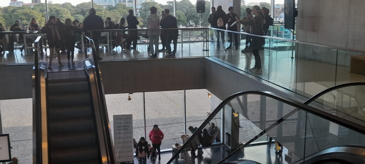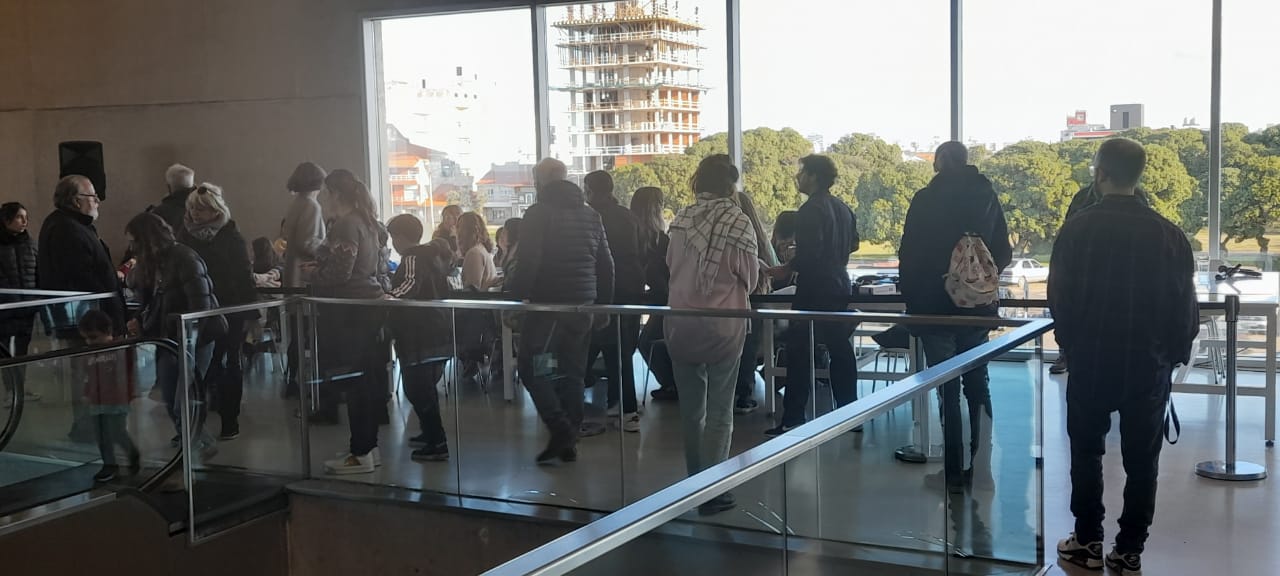 El grupo Lamba le puso música al inicio de Bienalsur 2023 en el Museo Mar de Mar del PlataComo en ediciones anteriores, el evento comenzó con un ritual musical con espíritu de fiesta, en este caso realizado por el grupo de percusión afrolatina Lamba, mientras en los visitantes participaban del extinto ritual marplatense de la ruleta para ganarse y degustar barquillos.