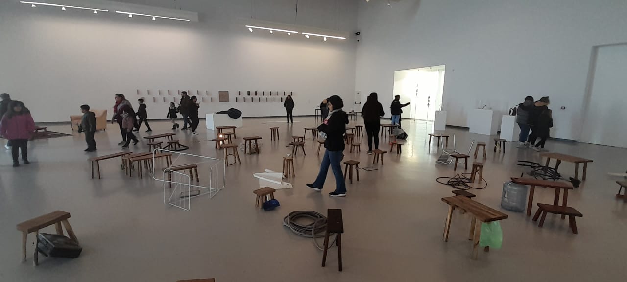 Instalación de Eugenia Calvo y detrás, Mimi LaquidaraUnas reposeras con estampas de Delia Cancela marcan, en el pasillo, el camino hacia la segunda sala, en la que apenas se ingresa La velocidad de las cosas, de Nicolás Bacal, toma el centro del espacio formando, a partir de banquitos de madera y mesas pequeñas, las 52 constelaciones del hemisferio sur.