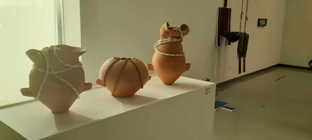 En esta sala también aparece Intenciones Muralistas dibujos de Mimi Laquidara realizados durante una residencia en México, en los que representa objetos de mercados, tianguis y tienditas del país norteamericano, junto a una instalación de Mariana Tellería, en la que la artista que representó a Argentina en la Bienal de Venecia de 2018 coloca de manera escalonada en una “articulación del mundo natural y cultural”, enumeró Battiti, objetos como un neumático, piedras y un caracol, entre otras.