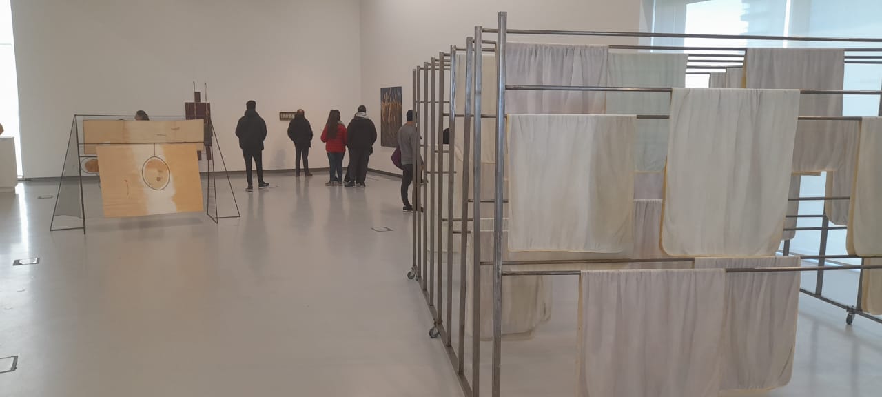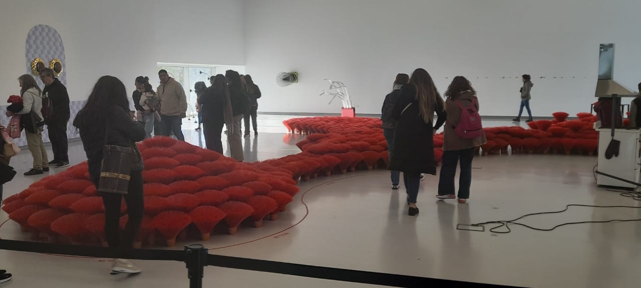 Ya en una de las dos grandes salas donde se distribuyen el resto de las obras, surge a primer golpe de vista el rojo furioso y cálido de Arrecife, de Gaspar Libedinsky, en el que recurre, como es costumbre en su trabajo, a elementos de limpieza. En este caso, a fibras plásticas 100% recicladas para componer una instalación de sitio específico efímera, “que durará cinco meses y luego serán convertidas en escobillones que se van a vender en negocios de la ciudad”, explicó el artista sobre esta pieza que se se expande por el centro de la sala y, a partir de la cual, propone una mirada sobre la relación con el medioambiente.