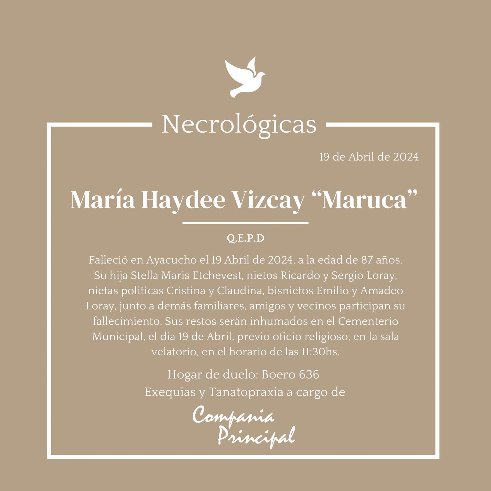 Falleció el viernes 19 de Abril en nuestra ciudad a la edad de 87 años, María Haydée Vizcay “Maruca”. Su hija Stela Maris Etchevest, nietos Ricardo y Sergio Loray, nietas políticas Cristina y Claudina, bisnietos Emilio y Amadeo Loray junto a demás familiares y seres queridos participaron de su fallecimiento. Sus restos fueron inhumados en el Cementerio Municipal el viernes 19 en horas de la mañana previo oficio religioso en sala velatoria. Hogar de duelo: Boero 636.
