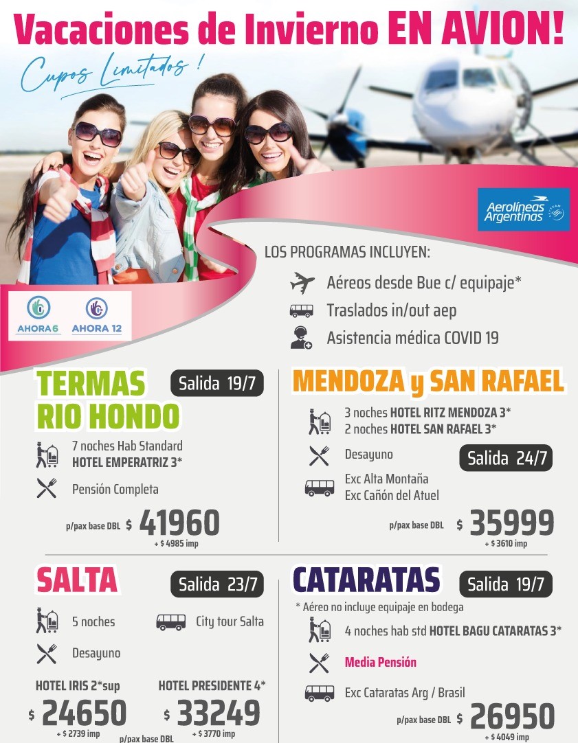 Marita Aranda Viajes y WAVE te ofrecen Vacaciones en Invierno en nuestro país y viajando en avión. Los programas incluyen traslados aéreos desde Buenos Aires con equipaje, traslados al aeropuerto en destino y asistencia médica Covid 19.