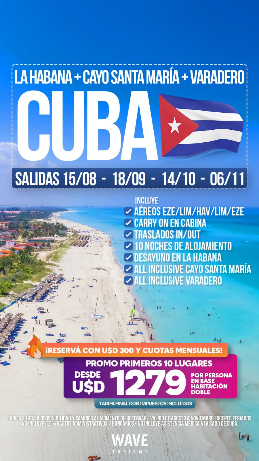 El viaje incluye aéreos desde Ezeiza, ida y vuelta, carry on en cabina, traslados in/out, 10 noches de alojamiento (desayuno en La Habana, All Inclusive en Cayo Santa María y Varadero).
