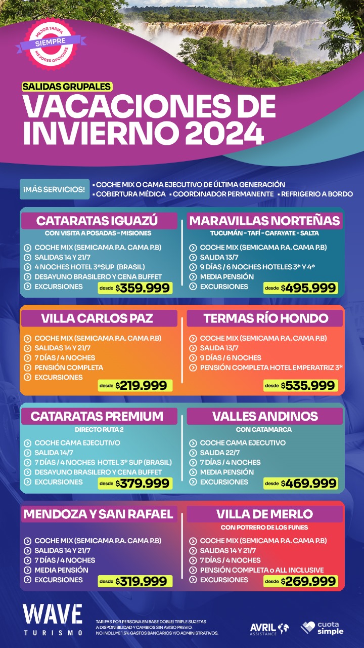 Marita Aranda y WAVE Viajes te proponen empezar a pensar en las vacaciones de invierno, con distintos lugares para recorrer nuestro hermoso país, con salidas grupales, coche mix (semi cama o cama ejecutivo), cobertura médica, coordinador permanente y refrigerio a bordo. Consultá con Marita en Murgier 1084 o al celular 2494 578431.