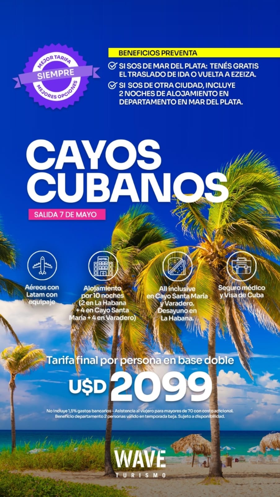 Marita Aranda y WAVE Viajes te llevan a uno de los lugares de las mejores playas del mundo. Sí, Los Cayos Cubanos tienen esa enorme particularidad que vos podés disfrutar en familia o con amigos, o ambos. Te ofrecemos salida el 7 de mayo de 2024, aéreos con Latam con equipaje incluido. Alojamiento por 10 noches (2 en La Habana, 4 en Cayo Santa María y 4 en Varadero, estos dos últimos destinos con All Inclusive). Consultá con Marita en Murgier 1084 o al celular 2494 57-8431