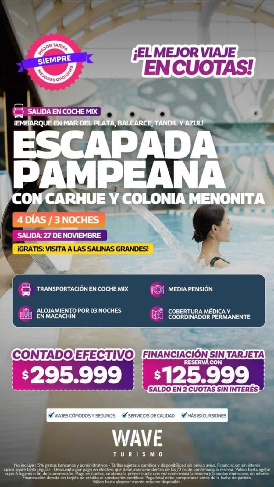 Marita Aranda y WAVE Viajes te llevan a una escapada pampeana, con recorrida por Carhue y Colonia Menonita. Salimos desde Mar del Plata, Balcarce, Tandil o Azul, para que ubiques el lugar que más cómodo te queda. Serán 4 días/3 noches partiendo el 27 de noviembre próximo. La propuesta incluye plan de Media Pensión, alojamiento por 3 noches, cobertura médica y coordinador permanente. Consultá con Marita en Murgier 1084 o al teléfono 2494 – 578431.
