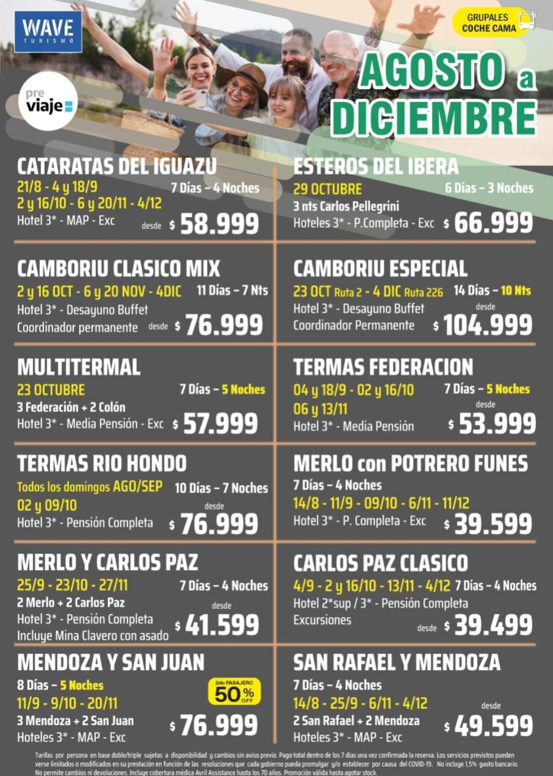 Marita Aranda y WAVE Viajes te ofrecen un montón de alternativas para recorrer el país que no podés desaprovechar. Destinos como Cataratas, Esteros del Iberá, San Rafael en Mendoza como también San Juan, Merlo, Carlos Paz, Termas de Federación como una escapada a Brasil, a Camboriú, todo de Agosto a Diciembre, grupales y en coche cama