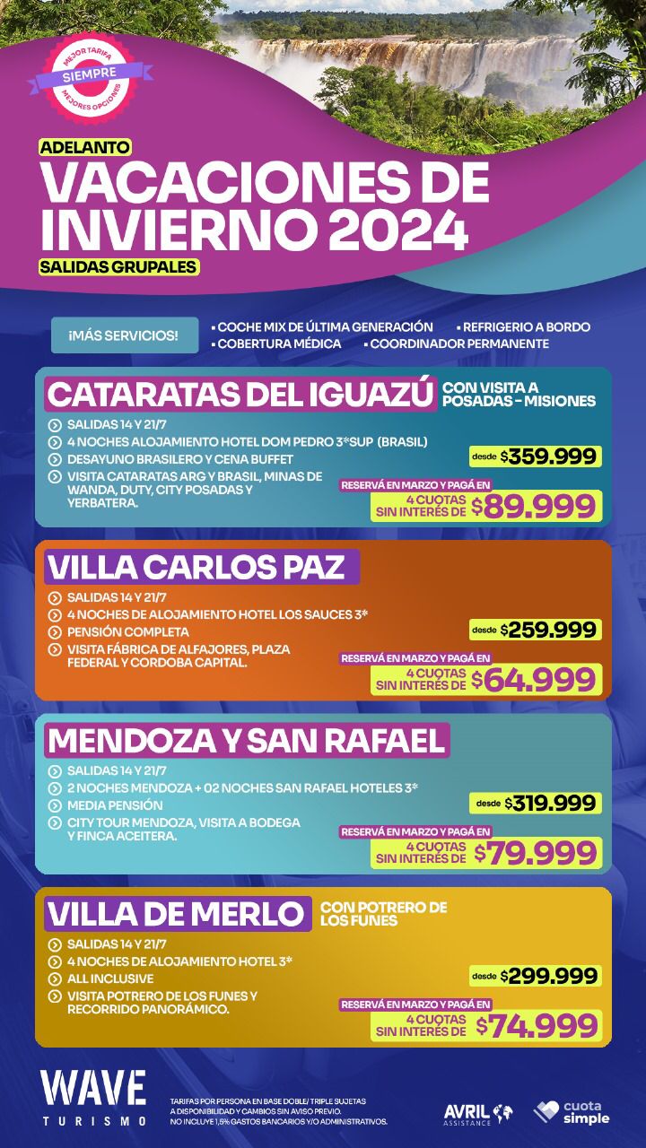 Los destinos pueden ser: Cataratas del Iguazú, Villa Carlos Paz, Mendoza y San Rafael, Villa de Merlo.