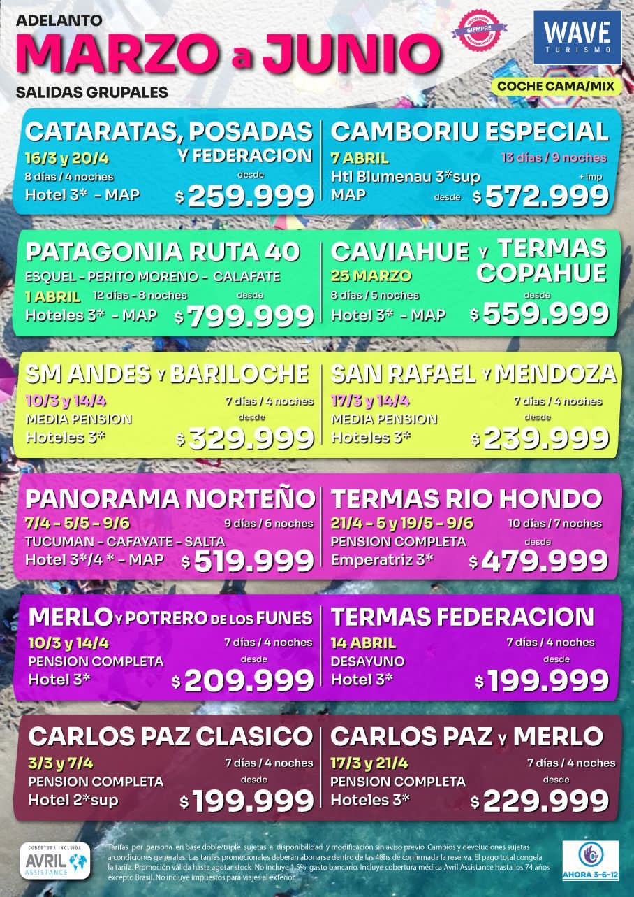 Marita Aranda y WAVE Viajes siguen con sus grandes alternativas para que disfrutes de tus merecidas vacaciones. Y no solo eso, también aproveches fuera de temporada alta, con salidas grupales a distintos lugares tanto del sur de Brasil como en nuestro hermoso país. Consultá con Marita en Murgier 1084 o al celu 2494 57-8431.