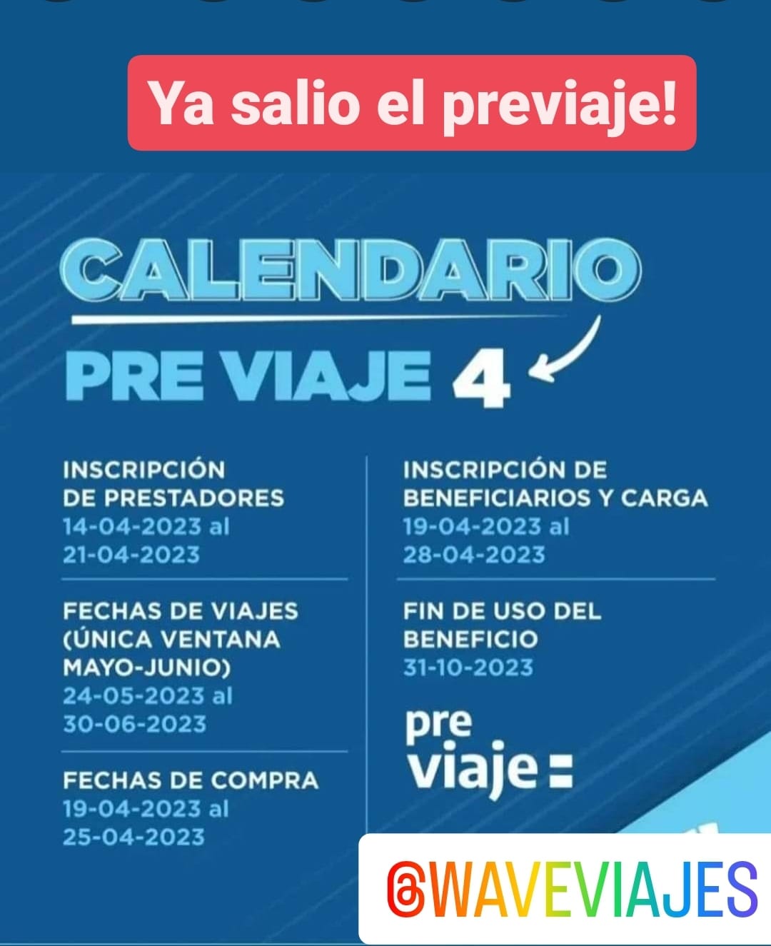 Marita Aranda y WAVE te ofrecen tus próximas vacaciones utilizando las bondades que entrega el gobierno argentino para disfrutar del país, con el lanzamiento ya del Pre Viaje 4. Las fechas son las siguientes: