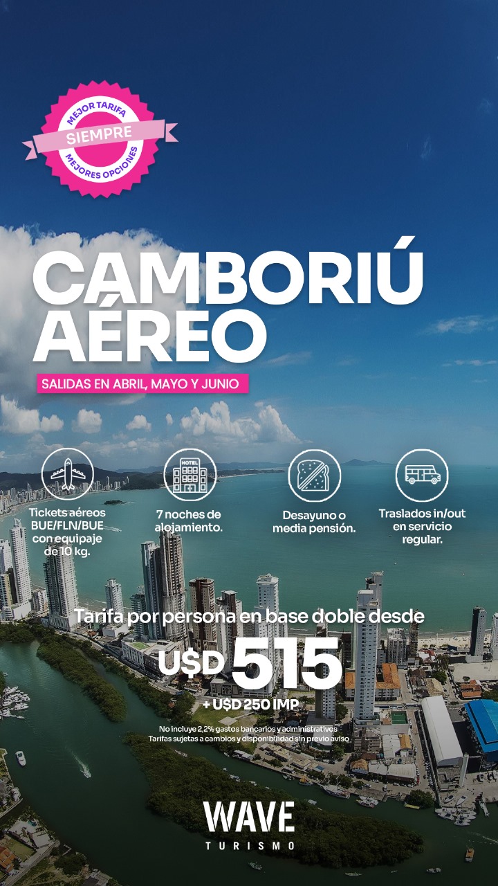 Te va Camboriú, en el sur de Brasil, pero en avión? Claro que sí!!!! Marita Aranda y WAVE Viajes te lo hacen posible. Contamos con salidas en los meses de Abril, Mayo y Junio, con aéreos Buenos Aires – Florianópolis – Buenos Aires, con equipaje de 10 kilos, más 7 noches de alojamiento, desayuno o media pensión, además de traslados.