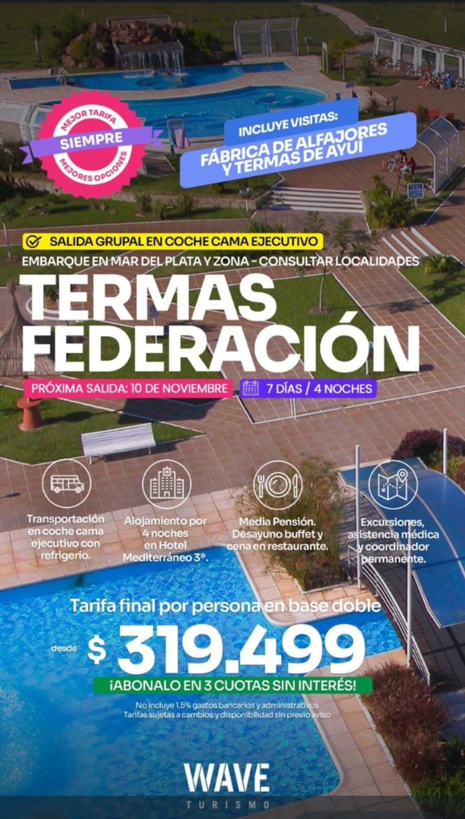 Marita Aranda y WAVE Viajes te llevan a Termas de Federación, con salida grupal en coche cama ejecutivo. La próxima salida será el 10 de Noviembre, con 7 días y 4 noches, con una excursión incluida a la fábrica de alfajores y a las termas de Ayui.