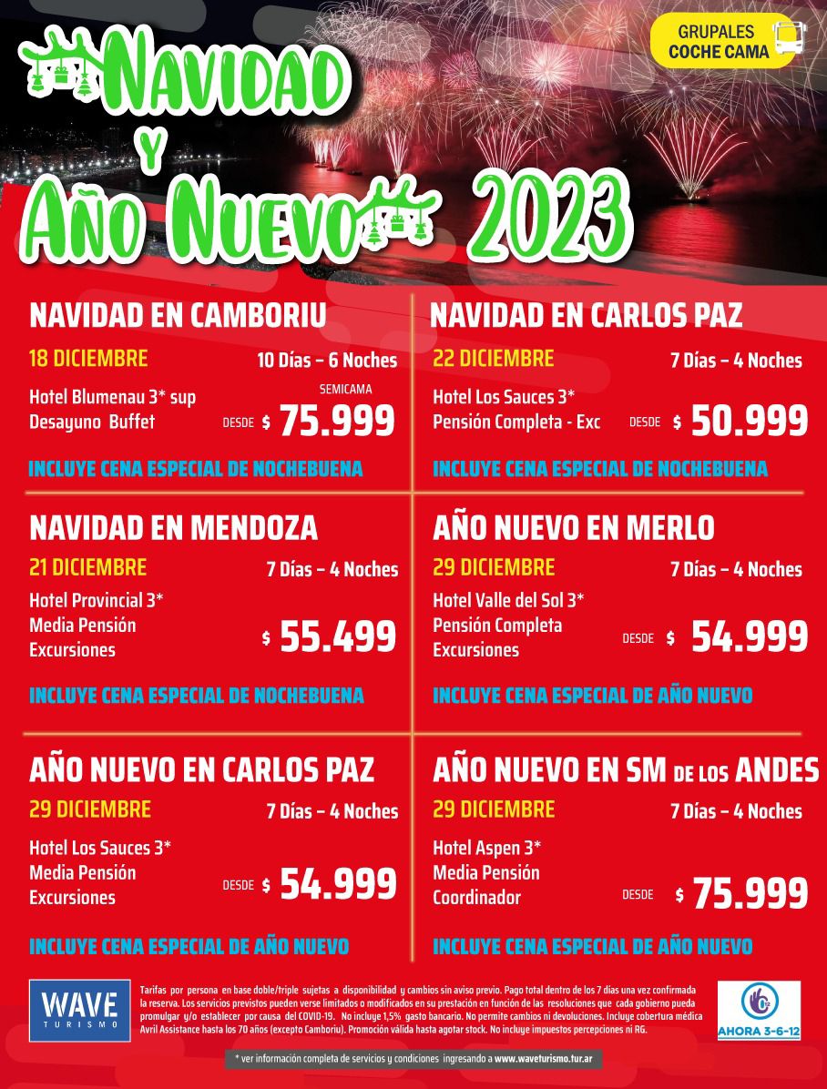 Marita Aranda Viajes y WEVE te proponen disfrutar de las Fiestas de Navidad y Fin de Año de una manera distinta, diferente, en distintos destinos que podrás disfrutar a pleno. Son salidas grupales en Coche Cama a destinos como Camboriú, Carlos Paz, Mendoza, Merlo, o San Martín de los Andes, incluso con una cena especial para la nochebuena o del 31 de Diciembre a la noche.