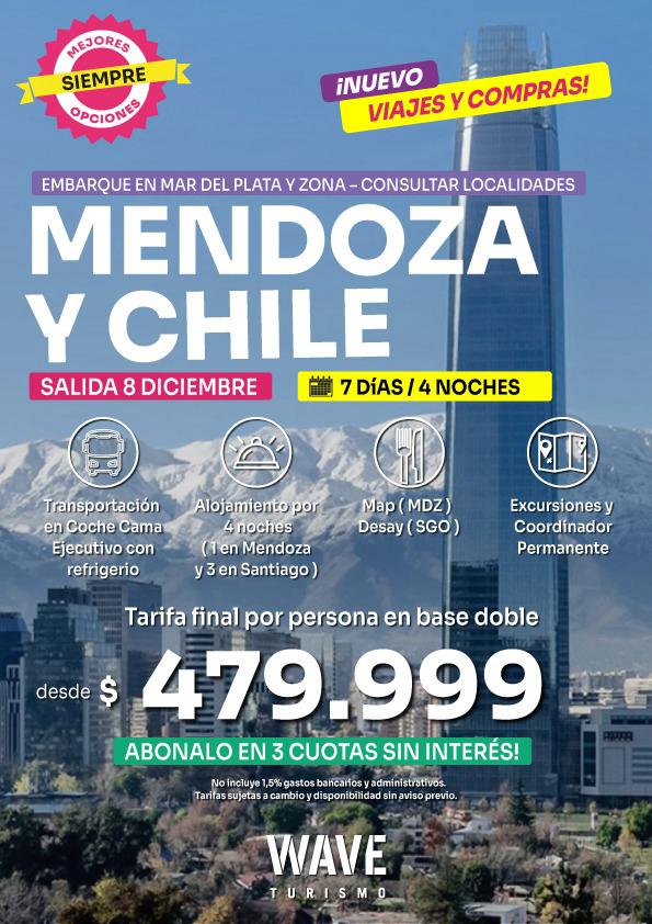 Marita Aranda y WAVE Viajes tienen una propuesta imposible de no aceptar. Se trata de Mendoza y Chile, con salida el 8 de Diciembre por un total de 7días/4 noches en coche cama ejecutivo con refrigerio. De las 4 noches de alojamiento, una es en Mendoza y las 3 restantes en Santiago, la capital chilena. La propuesta incluye excursiones y coordinador permanente.
