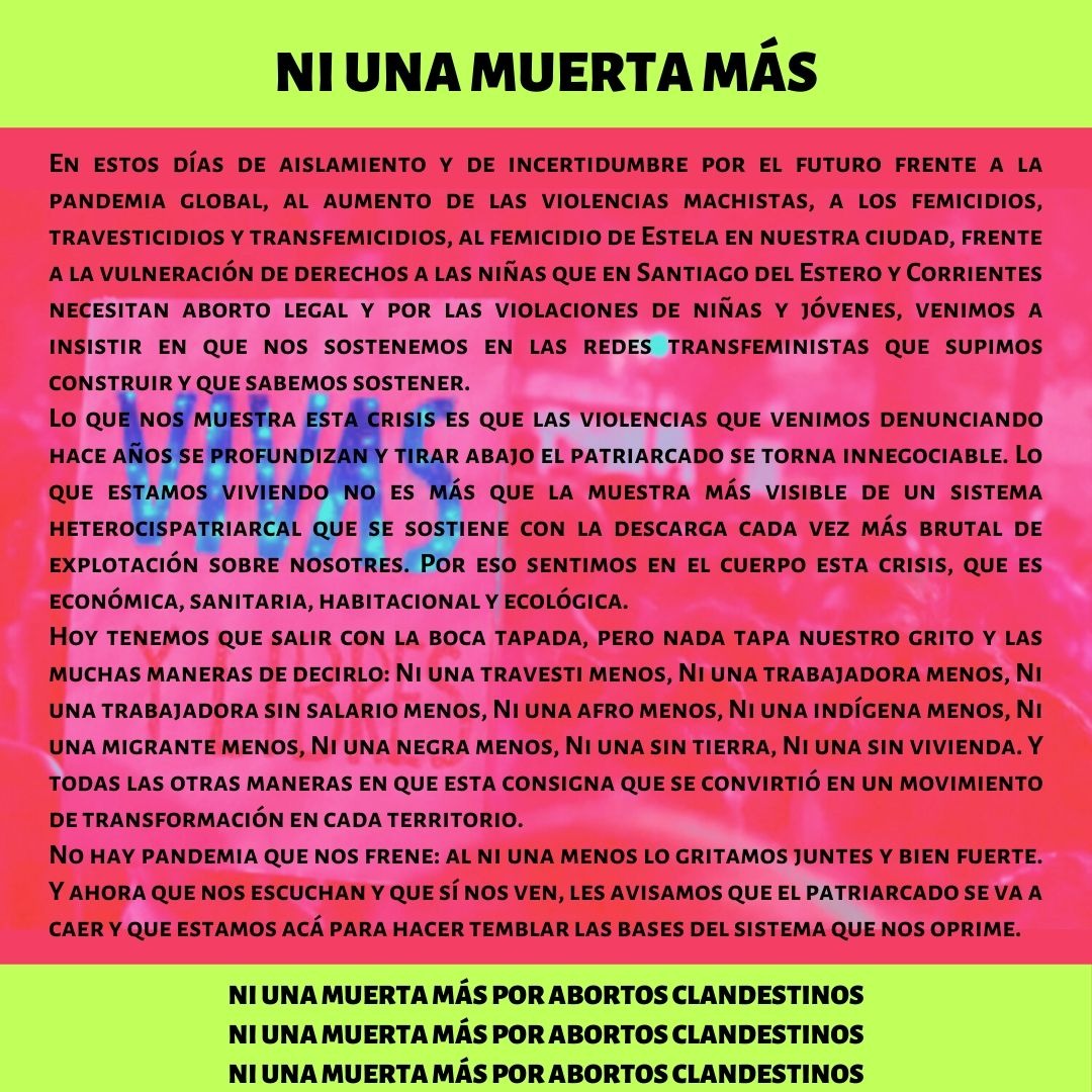 En estos días de aislamiento y de incertidumbre por el futuro frente a la pandemia global, al aumento de las violencias machistas, a los femicidios, travesticidios y transfemicidios, al femicidio de Estela en nuestra ciudad, frente a la vulneración de derechos a las niñas que en Santiago del Estero y Corrientes necesitan aborto legal y por las violaciones de niñas y jóvenes, venimos a insistir en que nos sostenemos en las redes transfeministas que supimos construir y que sabemos sostener.