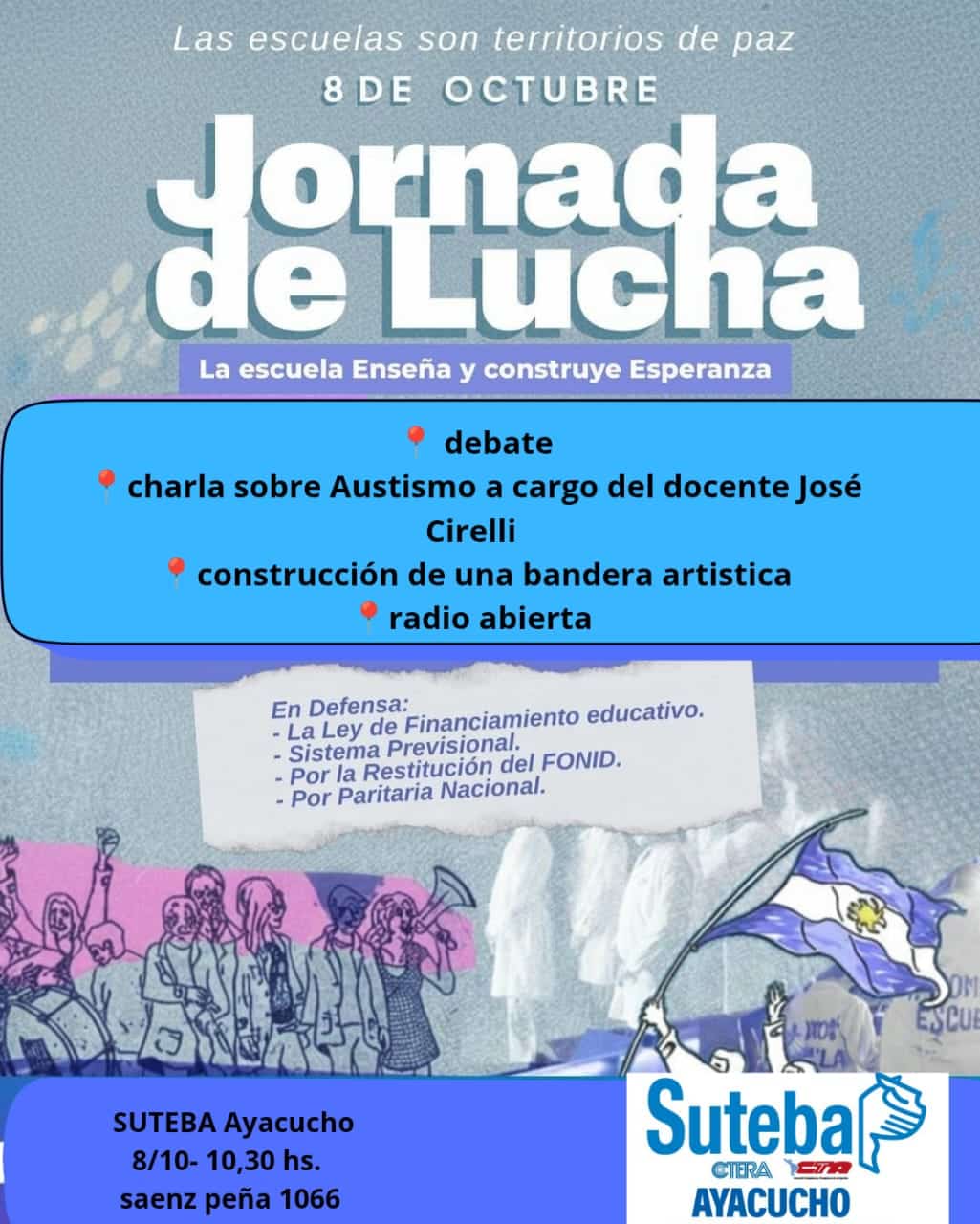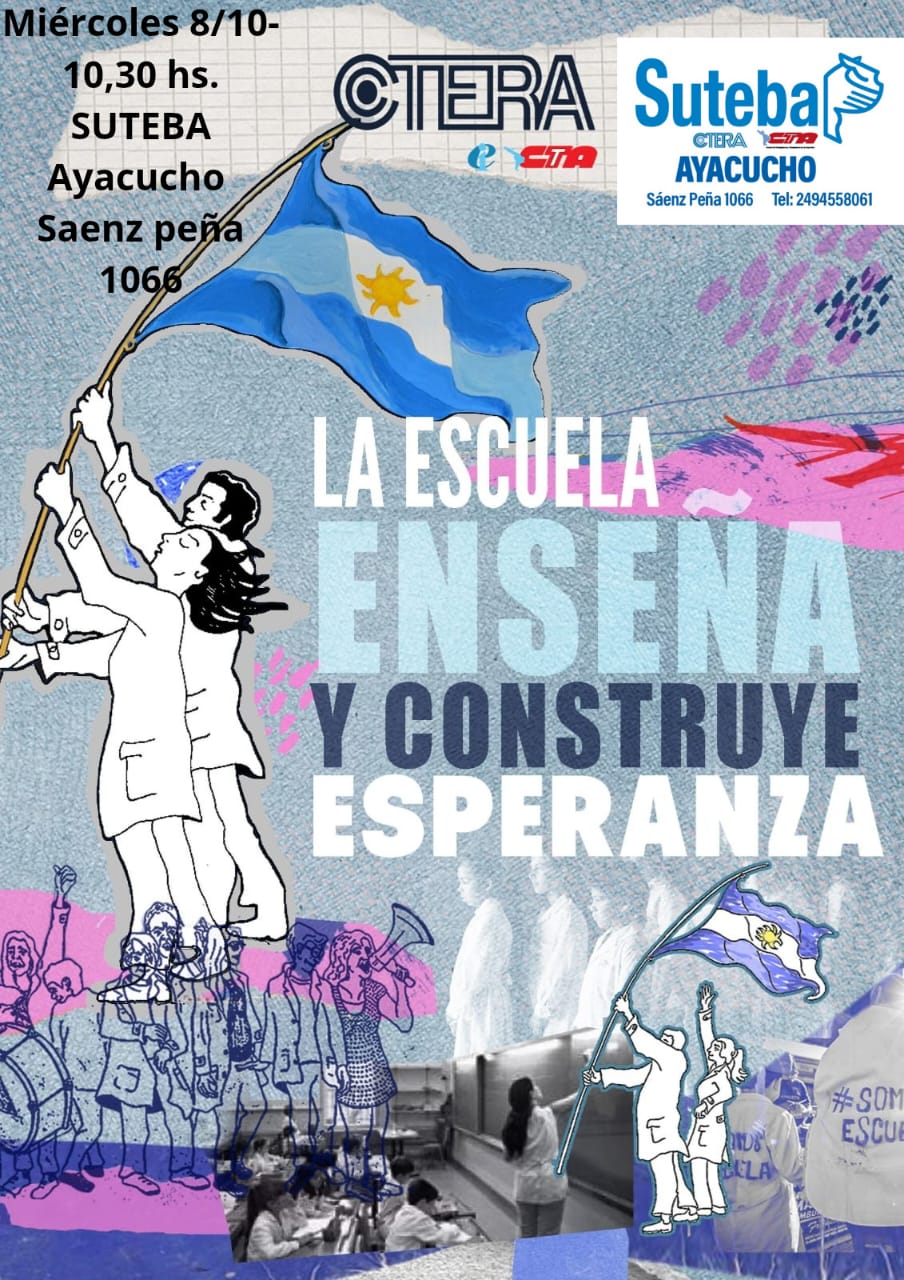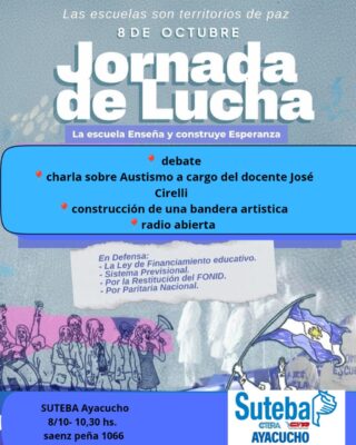 Hoy miércoles 8 de Octubre, los docentes realizarán una jornada de protesta contra el desfinanciamiento del sistema educativo que está impulsando el gobierno nacional a cargo de Javier Milei. Es por eso que en Ayacucho, se llevará a cabo desde las 10,30 horas, un evento de reflexión convocado por SUTEBA en su sede de Sáenz Peña 1066, a fin de manifestarse públicamente contra cada uno de los recortes que afectan el desarrollo del sistema educativo. Además, se anunció un Paro Nacional para el venidero martes 14 de Octubre.