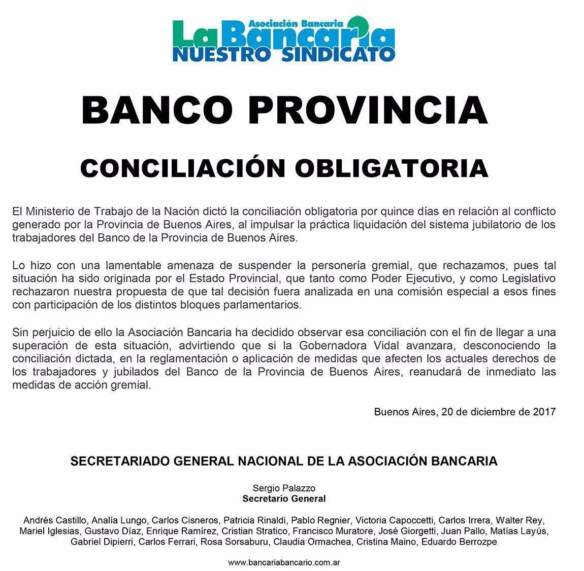 Finalmente habrá actividad en el Banco Provincia durante Jueves y Viernes, teniendo en cuenta que el Ministerio de Trabajo de Nación dictó este Miércoles la conciliación obligatoria en el conflicto que mantienen los trabajadores del Banco de la Provincia de Buenos Aires, que habían convocado a un paro de 48 horas para Jueves y Viernes, en rechazo de las modificaciones jubilatorias para el personal de la entidad.