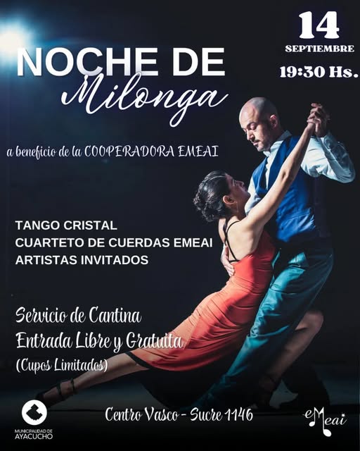 Desde la Escuela Municipal de Enseñanza Artística e Idiomas, invitan a la comunidad a participar de una velada especial de danza, un espectáculo de tango cuya recaudación estará destinada a colaborar con la Cooperadora de la institución. Será este domingo 14 de septiembre desde las 19:30hs en la sede del Centro Vasco, Sucre 1146.