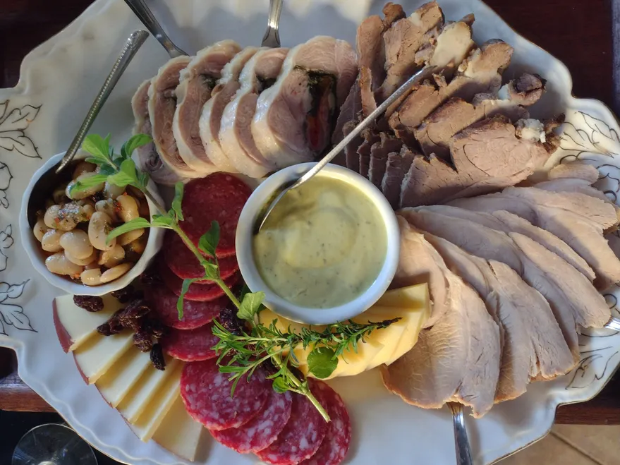 Enumera los ingredientes de estas tablas generosas: quesos y salames de diferentes clases, pollo arrollado, cerdo marinado con mostaza y hierbas, porotos y berenjenas al escabeche. Lo caliente se presenta en estos pasos: tortilla de papas y cebollas, tartas de acelga y de calabaza, mozzarellas rebozadas, cazuelas de tomates con albahaca, chorizo de cerdo con arvejas, cebolla y morrón. Todas las verduras se cosechan un rato antes.