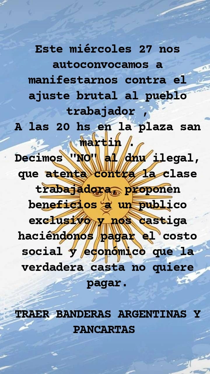Será a las 20 horas en la Plaza San Martín donde un grupo de vecinos autoconvocados invitan al resto de la comunidad a sumarse, con banderas argentinas, a marchar pacíficamente en contra de las nuevas regulaciones que intenta imponer el presidente Javier Milei a través de Decretos de Necesidad y Urgencia.