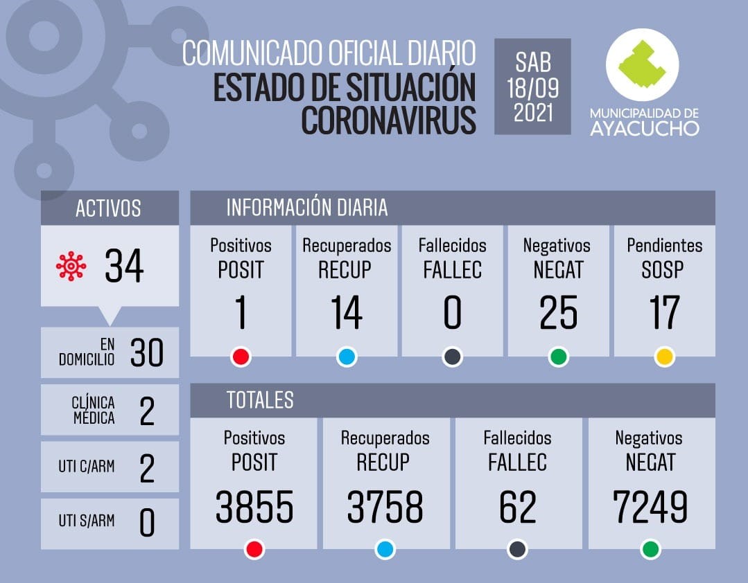 Nuevamente se produjo un fuerte descenso en los casos activos de Covid en las últimas 24 horas dado que solo se registró un solo positivo y hubo 14 pacientes recuperados. Con estos números, los activos actualmente son 34 de los cuales 4 se encuentran internados en el Hospital Municipal (2 en Clínica Médica y 2 en UTI).
