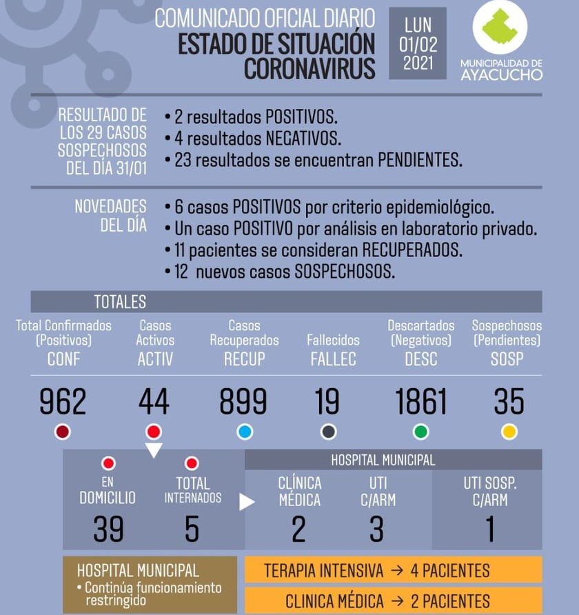 Un total de 9 casos positivos de Covid 19 se registraron este 1 de Febrero en nuestra ciudad, de los cuales 6 se dieron por criterio epidemiológico, y uno en un laboratorio privado. A los 23 resultados pendientes se sumaron 12 nuevos sospechosos en tanto que como hubo 11 recuperados, el número de casos activos volvió a bajar quedando en 44.