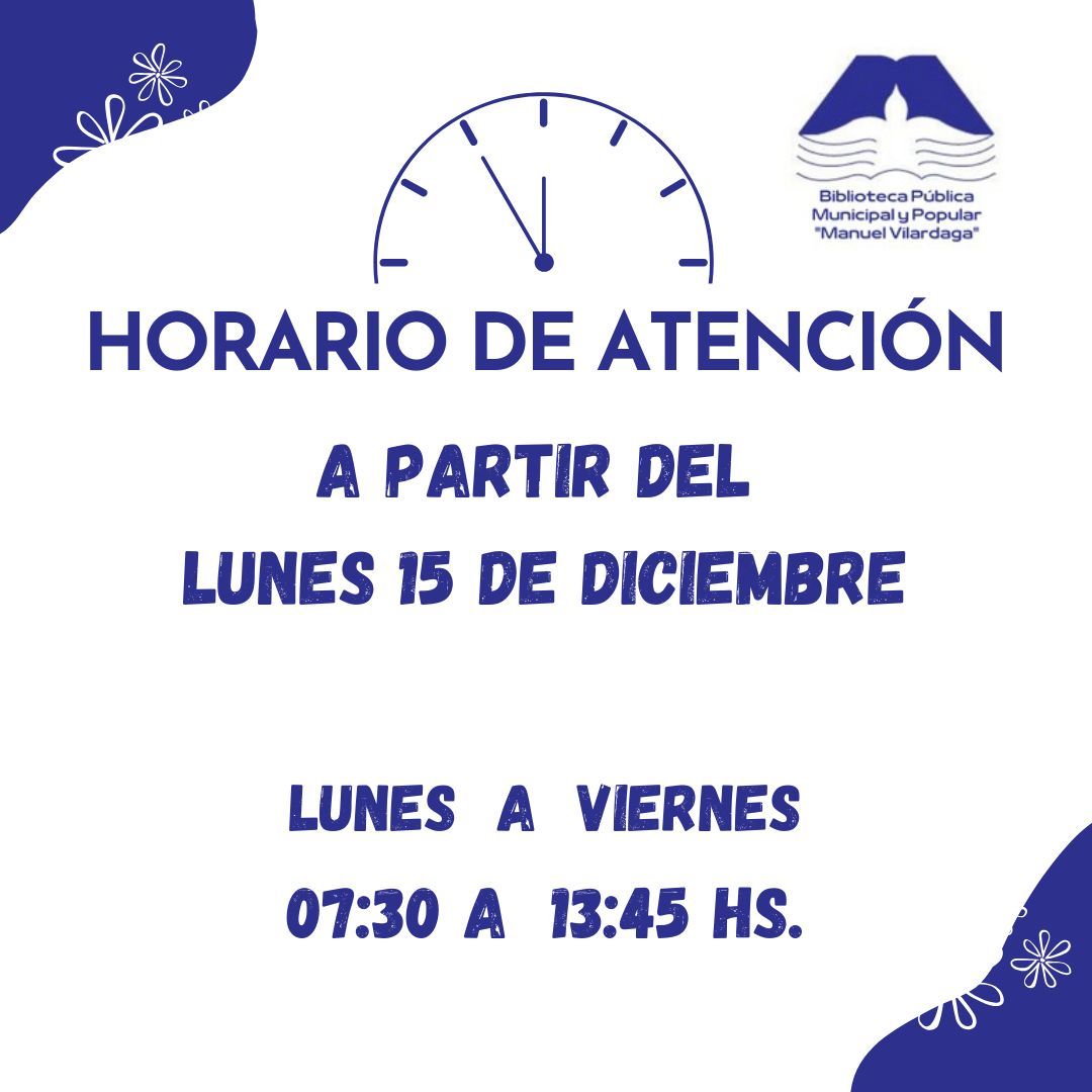 La Biblioteca Pública, Municipal y Popular “Manuel Vilardaga” informa a la comunidad que, seguimos con el nuevo horario de atención.