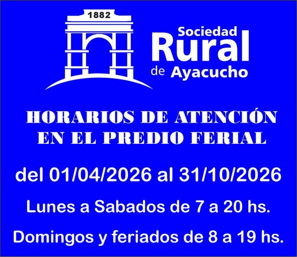 Nuevos horarios de atención del Predio Ferial de la Sociedad Rural de Ayacucho / Desde el 1- 4-26 31 marzo, 2026 Pablo Tusq Campo, campo DIA, destacados 0 X