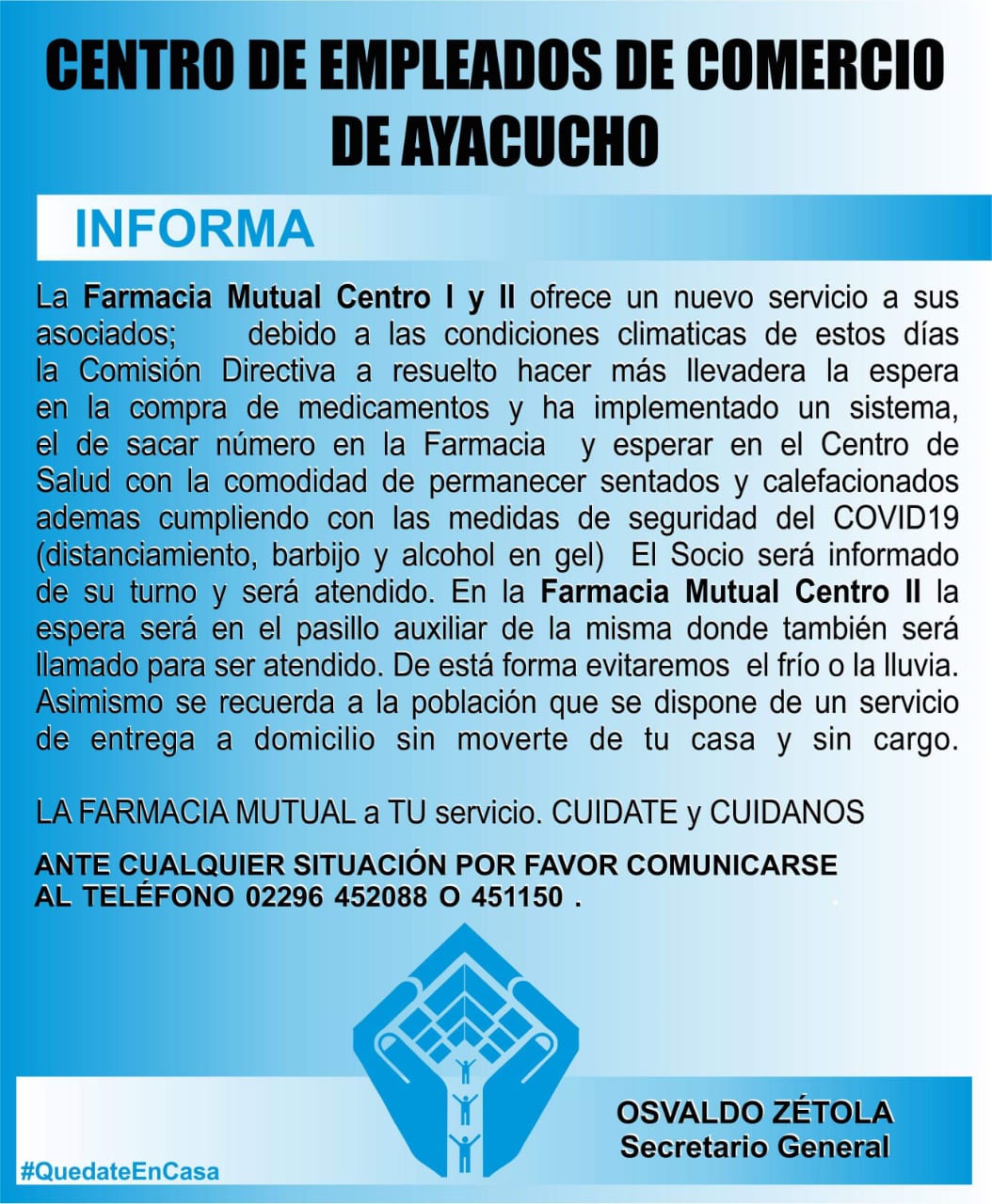El Centro Empleados de Comercio de nuestra ciudad, cuyo titular es Osvaldo Zétola, implementó nuevos servicios ante la continuidad de la cuarentena por la actual pandemia. Los mismos consisten en;