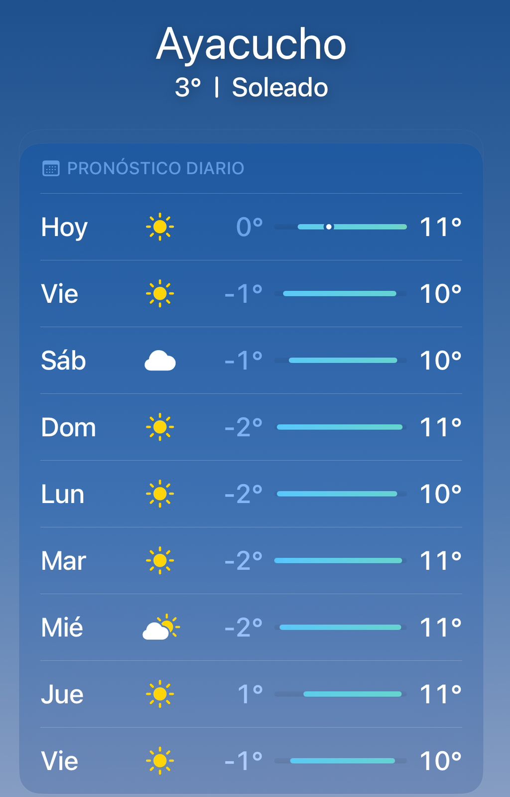 Será tan importante la ola polar que las mínimas serán al menos hasta el miércoles próximo de bajo cero todos los días, y las máximas no superarán los 10 u 11 grados. A favor tendremos que, salvo el sábado donde habrá cielo cubierto, el resto el sol ayudará a que no sea tan gélida la sensación térmica.