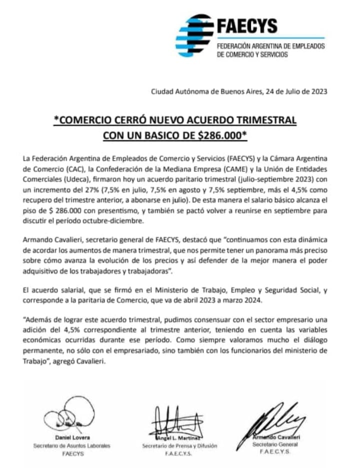 El Secretario General del Centro de Empleados de Comercio de Ayacucho, Osvaldo Zétola confirmó a este medio la noticia; «La Federación Argentina de Empleados de Comercio y Servicios (FAECYS) y la Cámara Argentina de Comercio (CAC), la Confederación de la Mediana Empresa (CAME) y la Unión de Entidades Comerciales (Udeca), firmaron hoy un acuerdo paritario trimestral (Julio-Septiembre 2023) con un incremento del 27% (7,5% en Julio, 7,5% en Agosto y 7,5% Septiembre no remunerativo, más el 4,5% remunerativo como recupero del trimestre anterior, a abonarse en Julio).