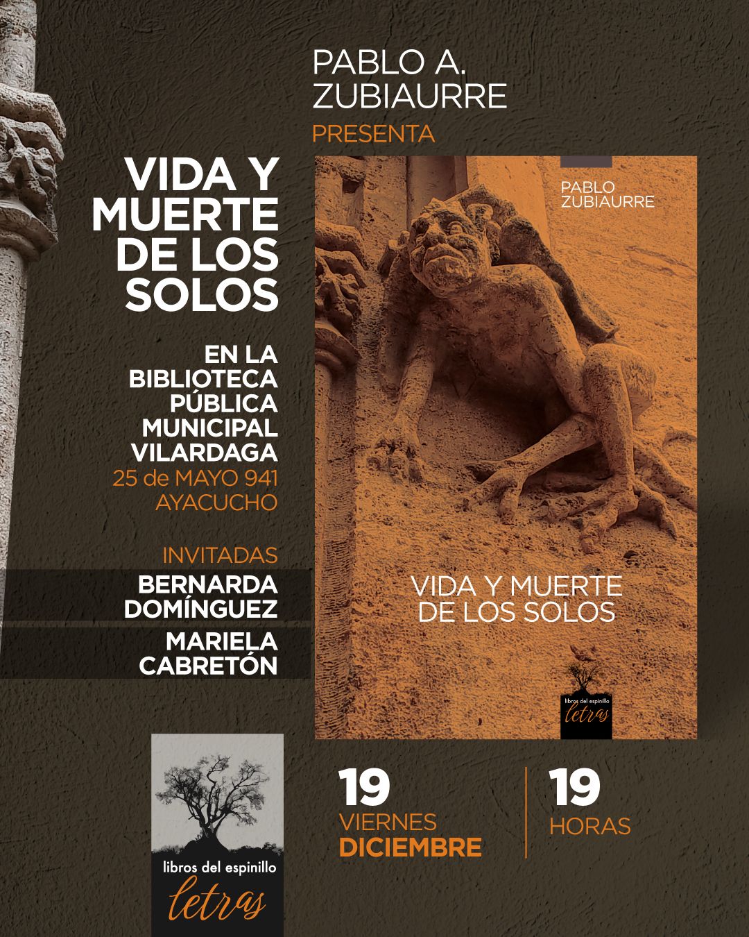 El historiador y escritor ayacuchense Pablo Zubiaurre, presentará un nuevo libro. Se tratá de “Vida y muerte de los solos”, en un evento que se desarrollará el venidero viernes 19 de Diciembre a las 19 horas en la Biblioteca Pública “Manuel Vilardaga”. La presentación del nuevo material literario contará como invitadas a Bernardo Domínguez y Mariela Cabretón.