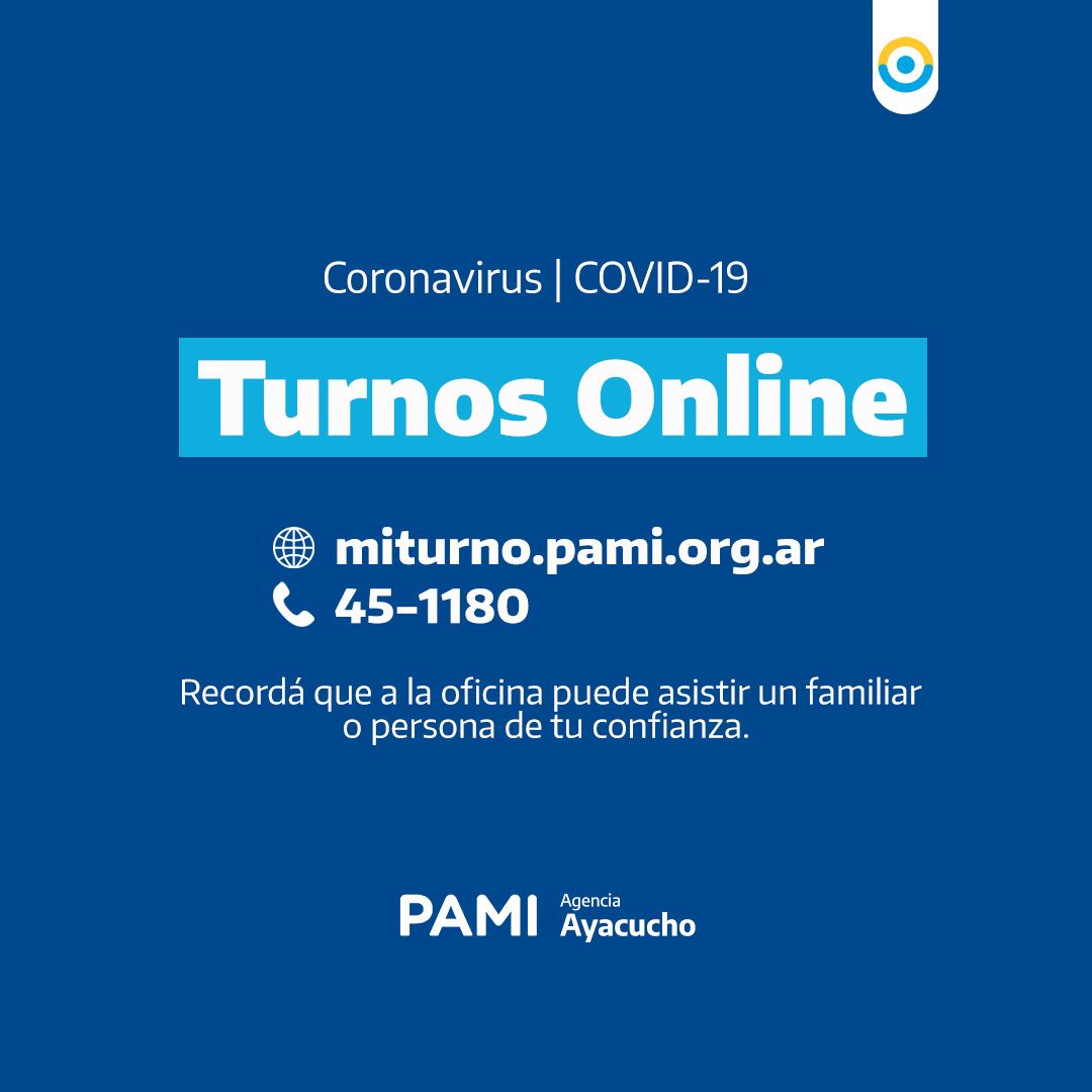 Debido a la situación epidemiológica, PAMI Agencia Ayacucho comunica que deben concurrir con turno previo a la Agencia. El mismo podrá ser gestionado a través de la pagina web: https://turnos.pami.org.ar/ o llamando al 45-1180.