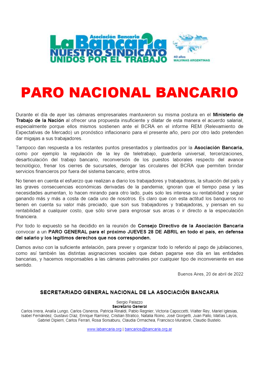 Por todo lo expuesto se ha decidido en la reunión de Consejo Directivo de la Asociación Bancaria convocar a un PARO GENERAL para el próximo JUEVES 28 DE ABRIL en todo el país, en defensa del salario y los legítimos derechos que nos corresponden.