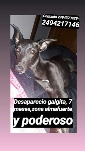 Te buscamos flaca…es negra pechito blanco tamaño mediano 7 meses orejitas grandes galguita sin collar. Si la ves o la tenés en tu casa por favor avísanos 2494 004160, 2494 323929. CONTAMOS CON VOS .