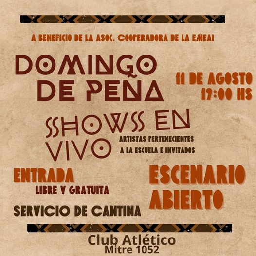 Invitamos por este medio a la comunidad a la Peña a beneficio de la Asociación Cooperadora de la Escuela Municipal de Enseñanza Artística e Idiomas, a realizarse este domingo 11/08 a las 19 hs. en las instalaciones del Club Atlético.