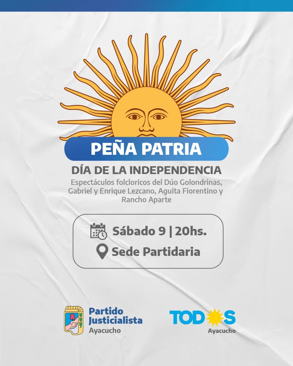 La nueva conducción del Partido Justicialista de Ayacucho realizará el venidero sábado 9 de Julio, desde las 20 horas en su sede partidaria, una Peña Patria a la que invitan a toda la comunidad. Allí habrá distintos espectáculos folclóricos como el Dúo Golondrinas, Gabriel y Enrique Lezcano, Aguita Fiorentino y Rancho Aparte.